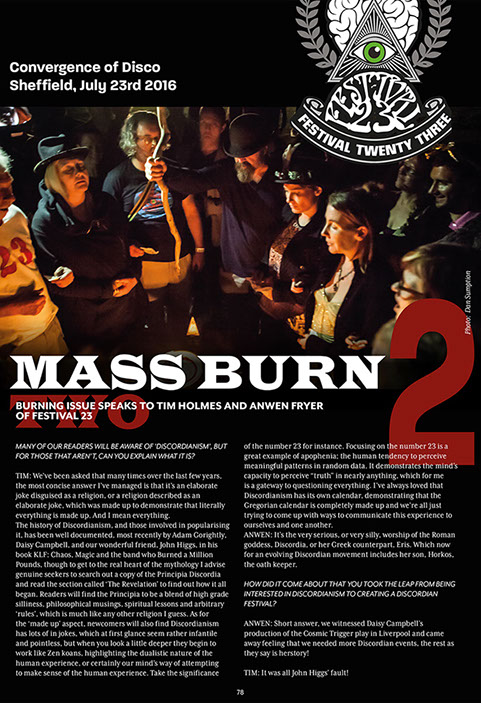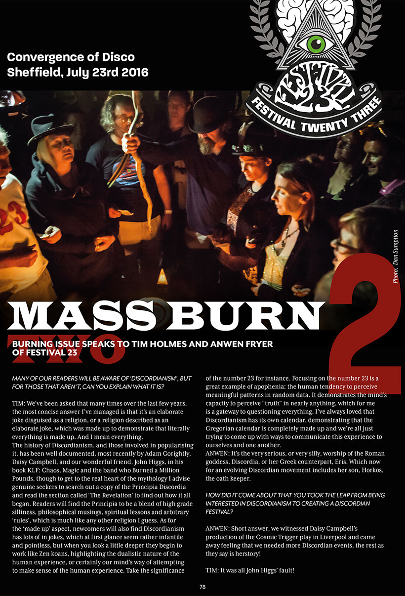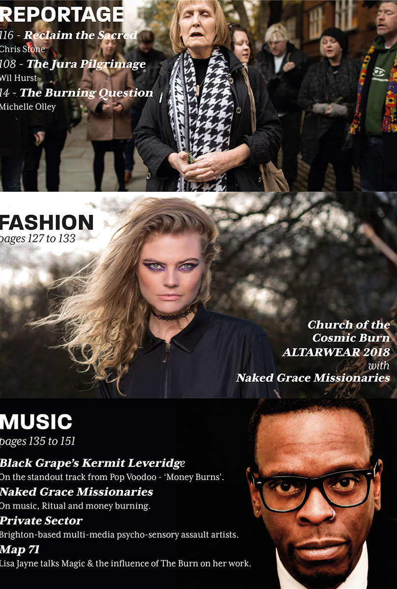 The opening statement in Volume One (and all subsequent iterations) is provided by 'Spirit of Burn' who is described in a footnote as an 'Entity-Object' manifested between a future 'Social Dreaming Matrix' and the reader's own mind. 'Spirit of Burn' then, exists beyond time and space - as an eternal witness to the 'becoming of nothingness'. All earthly events are viewed from the perspective of the 'nothingness event horizon'. Hence time and space and the materiality of the universe appear to Spirit of Burn as the fuel that feeds our eternally recurring transformation into 'the Divine Nothingness' of 'True Being'. This theology is captured in Spirit of Burn's sign-off which is repeated in all iterations of the magazine; 'Burn, Shine. Tick, Tock.'