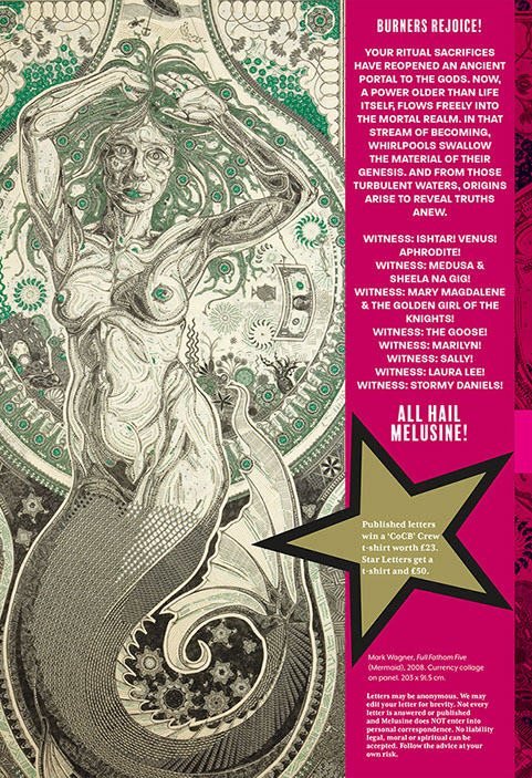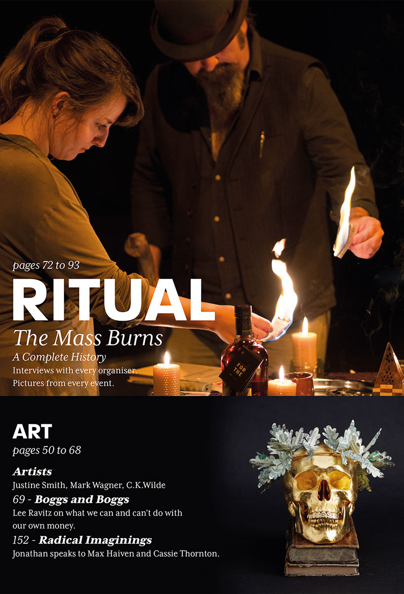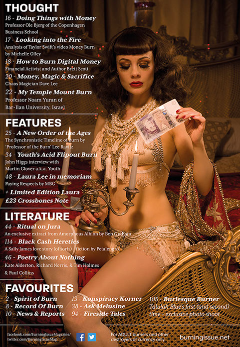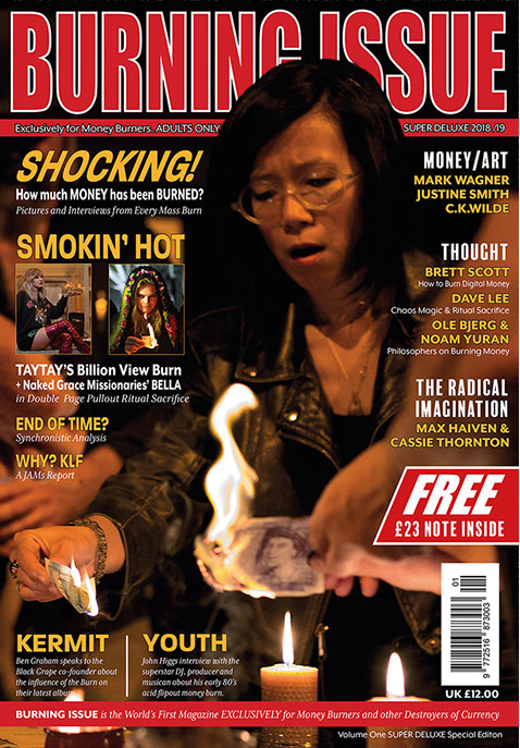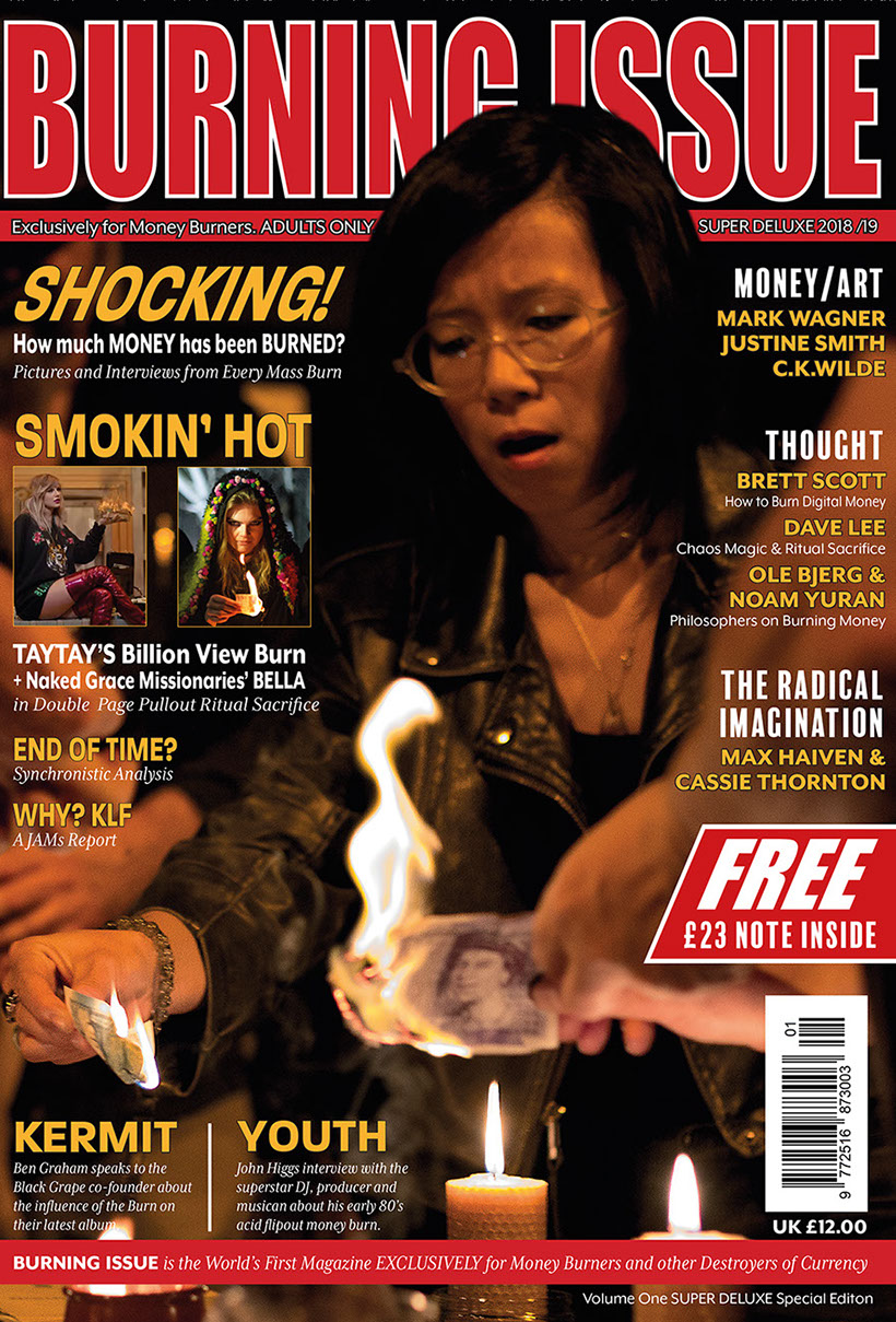 From the very first page of this very first edition it is made clear that the magazine is 'for burners only'. Volume One (and all subsequent iterations) exists primarily as a 'magical invocation' which seeks to immanentize 'Total Burn'. This when Money Burning (and/or the destruction of currency by other means) becomes the primary sacrificial ritual of humankind and when sacrifice itself, rather than self-interest, is recognised as axiomatic to exchange relations, the economy and individual sovereignty.
