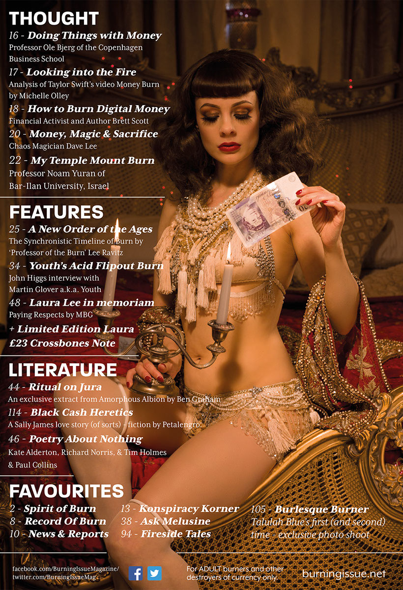 "Whilst Burning Issue speaks directly with you - the money burners and destroyers of currency - the fact of its existence as the world's first magazine serving this community will, by the magic of its being, unlock new possibilities. As the flame does to a moth, we will draw the pitiable dwellers in the darkness toward the Divine Light of the Burn so for one precious moment without worth, they will experience the purity of being."