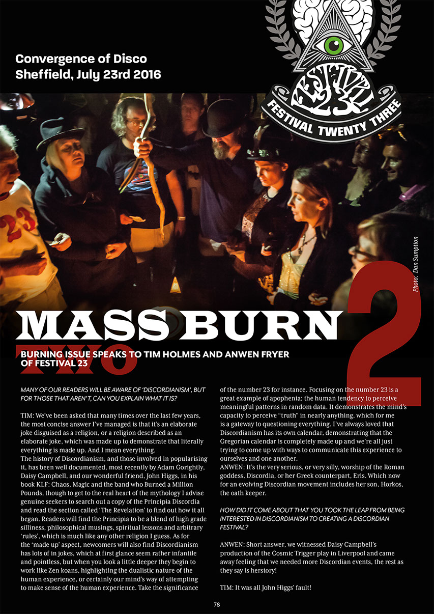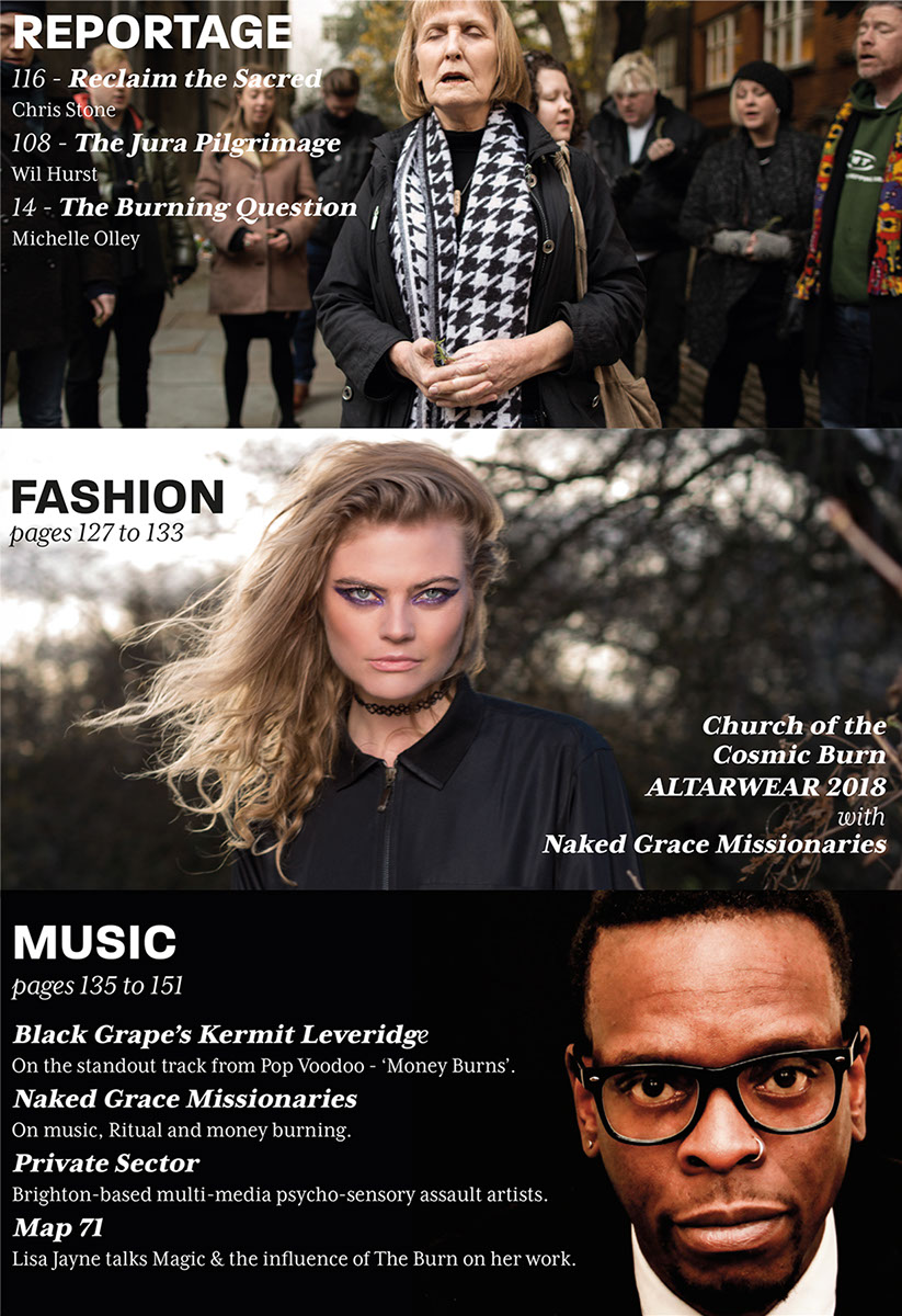 The opening statement in Volume One (and all subsequent iterations) is provided by 'Spirit of Burn' who is described in a footnote as an 'Entity-Object' manifested between a future 'Social Dreaming Matrix' and the reader's own mind. 'Spirit of Burn' then, exists beyond time and space - as an eternal witness to the 'becoming of nothingness'. All earthly events are viewed from the perspective of the 'nothingness event horizon'. Hence time and space and the materiality of the universe appear to Spirit of Burn as the fuel that feeds our eternally recurring transformation into 'the Divine Nothingness' of 'True Being'. This theology is captured in Spirit of Burn's sign-off which is repeated in all iterations of the magazine; 'Burn, Shine. Tick, Tock.'