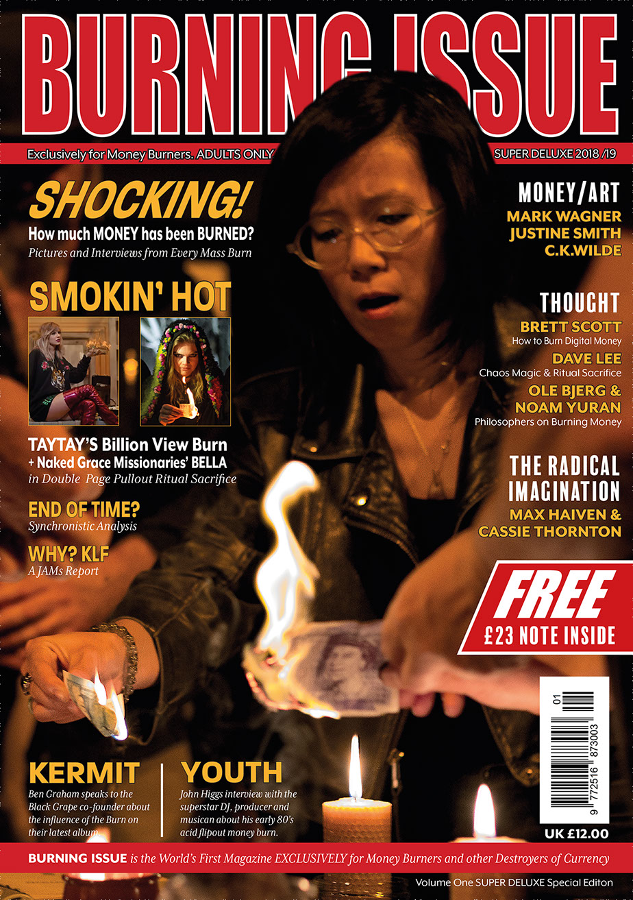 From the very first page of this very first edition it is made clear that the magazine is 'for burners only'. Volume One (and all subsequent iterations) exists primarily as a 'magical invocation' which seeks to immanentize 'Total Burn'. This when Money Burning (and/or the destruction of currency by other means) becomes the primary sacrificial ritual of humankind and when sacrifice itself, rather than self-interest, is recognised as axiomatic to exchange relations, the economy and individual sovereignty.